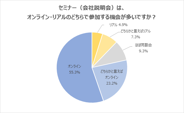 「セミナー(会社説明会)は、オンライン・リアルのどちらで参加する機会が多いですか?」という質問に対し、「オンライン」「どちらかと言えばオンライン」と回答した学生が78.5%に上りました。「リアル」「どちらかと言えばリアル」の回答は12.2%に留まっており、オンラインでのセミナーに参加する学生が多いことが分かります。