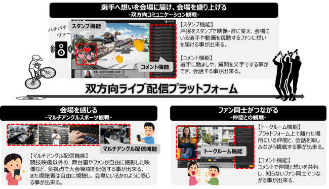2022年は、本スポーツのもうひとつの魅力である「競技を通じた選手やファンの絆」をICTで体感、絆をさらに深め紡ぐ事に挑戦するため、本プラットフォームにより、会場と遠隔地からの観戦者をつなぎ、選手とファンや遠隔地からの観戦者同士が双方向なコミュニケーションで応援し合うことで、双方向性やマルチアングルによる複数映像の同時配信を組み合わせた新たなスポーツ観戦スタイルの提供に挑戦します。なお、本プラットフォームをスポーツ分野で活用するのは初の試みになります。