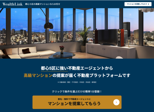 この度、プロパティーマーケットからリリースされた新サービス「WealthLink( https://wealthlink.jp)」は、「都心5区」で高級マンションの購入を希望されるユーザーと「都心5区」に詳しい厳選された不動産エージェントを効率的にマッチングさせるサービスになります。