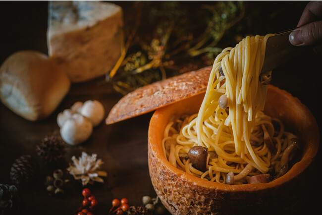 ミモレットチーズは熟成が進むと外皮が硬くなりごつごつとした印象を持つ方もいるかと思いますが、中身は鮮やかなオレンジ色をしており、カラスミのような深い旨みが特徴のチーズです。当店の「ミモレットチーズの濃厚カルボナーラ」は、そんなミモレットチーズをくりぬいた「カルボナーラ専用鍋」を使ってお客様の目の前で仕上げていきます。可愛らしいミモレットチーズのフォルムや、目を引くパフォーマンスでメディアからも多数取り上げられており、公式SNSでの動画は1万回再生されるなどいま注目を浴びている商品です。