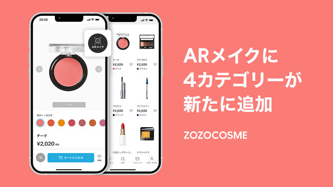 ファッションEC 「ZOZOTOWN」(https://zozo.jp/)を運営する株式会社ZOZO(本社:千葉県千葉市 代表取締役社長兼CEO:澤田 宏太郎)は、ZOZOTOWN上のコスメ専門モール「ZOZOCOSME」で提供している機能「ARメイク」の対応カテゴリーに、チーク、アイブロウ、アイライナー、マスカラの4カテゴリーを本日新たに追加しました。