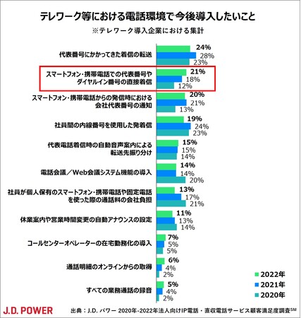 テレワーク等における電話環境で今後導入したいことを聴取したところ、「代表番号にかかってきた着信の転送」(24%)が昨年に続き最も多いものの、昨年の28%から減少している。