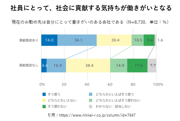 ある調査では、貢献意欲の高い社員ほど働きがいが強いというデータが出ています。