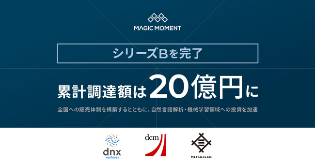 株式会社Magic Moment (本社:東京都港区、代表取締役CEO:村尾祐弥、以下「当社」)は、2022年9月7日、シリーズBラウンドを完了したことをお知らせします。本ラウンドでは、DNX Ventures をリードインベスターとし、DCMベンチャーズ、新たに三井物産を引受先として第三者割当増資を実施いたしました。今回の増資により、2017年3月の創業以来、金融機関からの融資を含む累計調達額は20億円となります。
