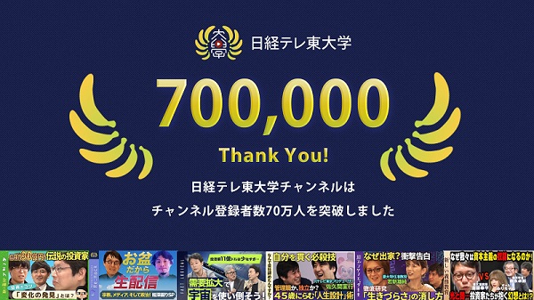 テレビ東京コミュニケーションズ(本社:東京都港区、以下TXCOM)と日本経済新聞社(本社:東京都千代田区)が共同で運営する、経済・ビジネスを楽しく学べるYouTubeチャンネル『日経テレ東大学』は、登録者数が70万人を突破したことをお知らせ致します(2022年8月末時点)。