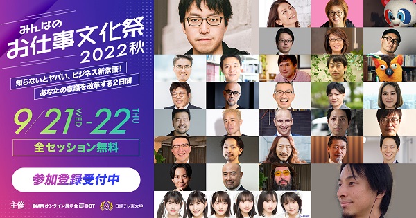 更に9月21日、22日には初の大型イベントとして、オンラインオフライン同時開催のビジネスカンファレンス『みんなのお仕事文化祭 2022秋』を合同会社DMM.com(東京都港区、会長 兼 CEO 亀山敬司 以下、「DMM」)と共同開催いたします。