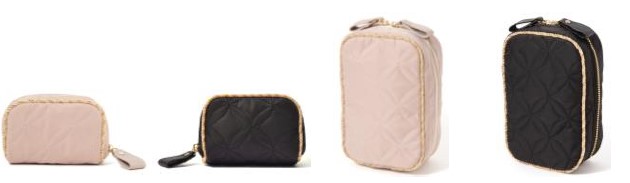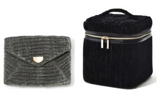 ベロア地にプリーツ加工を施したエレガントなデザインのフラットポーチとバニティポーチはシックな秋冬のスタイルにぴったり。どちらもゴールドがアクセントになっていて大人かわいい雰囲気が魅力
