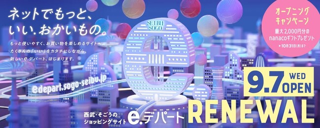 西武・そごうのショッピングサイトe.デパートは9月7日(水)にリニューアルオープンいたしました。リニューアルを記念して限定商品の販売やe.デパートのお買い物にご利用いただけるnanacoギフトが当たるリニューアルキャンペーンなどを実施します。また、サイトのデザインも刷新し、スマートフォンでの操作性を踏まえて、お客さまにより快適にお買い物をしていただけるサイトになりました。