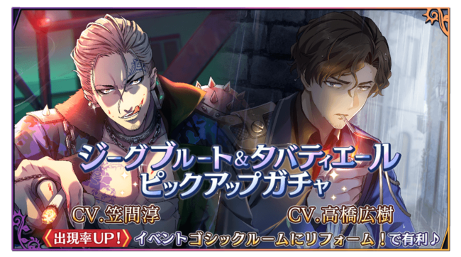 好評開催中のイベント「ゴシックルームにリフォーム!」の攻略に役立つ「ジーグブルート(CV:笠間淳)」と「タバティエール(CV:高橋広樹)」の特攻カード、★3「【独り、非道を往く末】ジーグブルート」と★3「【失意の雨】タバティエール」が登場する、期間限定のピックアップガチャを開催いたします!