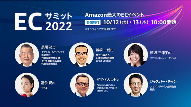 アマゾンジャパン(所在地:東京都目黒区)は、10月12日(水)から13日(木)の2日間、「Amazon ECサミット2022( http://amazon-ec-summit.jp )」をオンラインで開催いたします。Amazon ECサミットは、日本のAmazonにおける最大のECイベントで、今年で2回目の開催となります。このイベントではECを通じて事業の拡大を目指す中小企業をはじめとする販売事業者様を対象に、AmazonのECビジネスに関する最新動向をお伝えします。