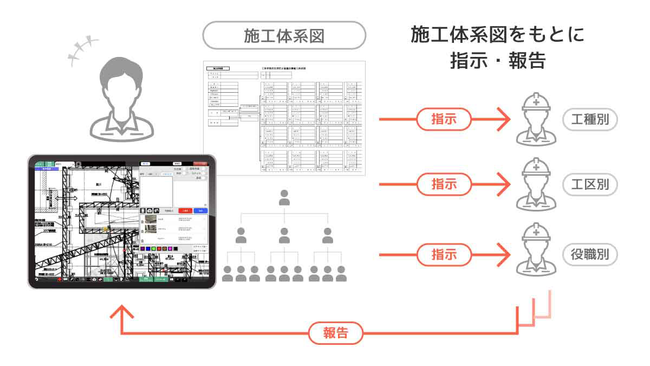 本発明は、「施工体系図」をはじめとした建設現場の施工体制に基づき、建設現場における事業者間の作業指示/完了報告などの情報共有を可能とする技術です。