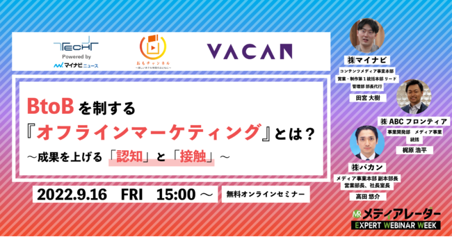 株式会社アイズ(所在地:東京都渋谷区、代表取締役社長:福島範幸)が運営するNo.1*の媒体資料ポータルサイト「メディアレーダー」は、9/16(金)にマーケティングセミナーイベント、第7回 メディアレーダー EXPERT WEBINAR WEEKにて、「BtoBを制する『オフラインマーケティング』とは?~成果を上げる『認知』と『接触』~」を開催します。BtoBマーケティングの専門家たちが登壇するオンラインセミナーで、参加申し込みは無料です。