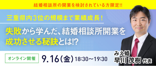 【9月16日開催】結婚相談所開業・副業を検討の方向けオンラインセミナー!三重県内3位の規模まで業績成長!失敗から学んだ、結婚相談所開業を成功させる秘訣とは!?