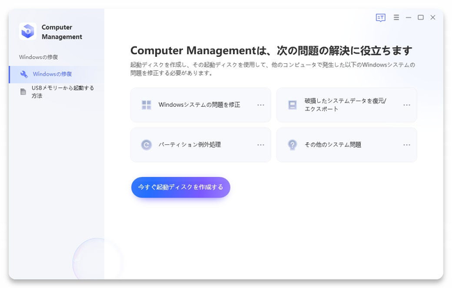 まず1つ目は、Windowsに発生した問題を解決する専門ツールPassFab Computer Managementで修復する方法です。PassFab Computer Managementはブルースクリーン、パソコンが起動できないなど様々なトラブルを解決でき、専門性の高い機能を備えながらも非常に使いやすい点が特徴です。その機能は以下のとおりです。