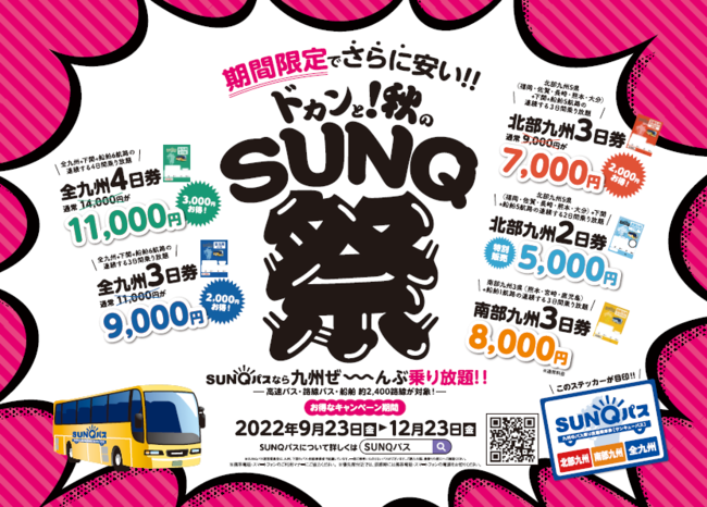 九州・山口の47のバス・船舶事業者が加盟するSUNQパス運営委員会(事務局:西日本鉄道株式会社、運営委員長:宮崎泰)では、2022年9月23日から12月23日までの期間、「ドカンと!秋のSUNQ祭」キャンペーンを実施します。