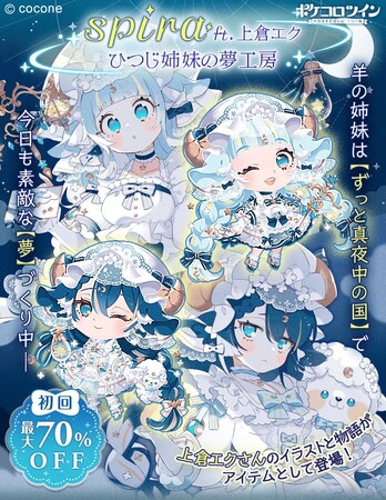 ココネ株式会社(以下「ココネ」)は、アバターの着せかえやお客様同士のコミュニケーションを楽しむスマートフォン向けアプリ『ポケコロツイン』において、キャラクターデザインや漫画など幅広く活躍される人気絵師 上倉エクさんが書き下ろしたイラストをアイテム化し、それらを記念したイベントの開催をお知らせします。なお、本プロジェクトは第三弾まであり、それぞれ異なる人気イラストレーターと取り組む予定です。
