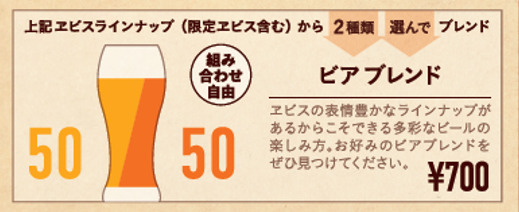 ヱビスラインナップの上記5種類から2種類を選び、ブレンドできます。表情豊かなラインナップがあるからこそできる多彩なビールの楽しみ方です。