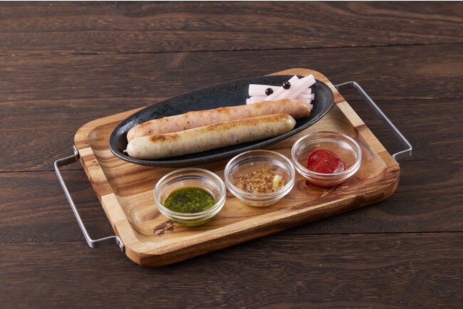 こだわりのソーセージ(2本を)和ハーブヴェルデ、レモンハニーマスタード、スパイストマトの3種のディップソース付き。