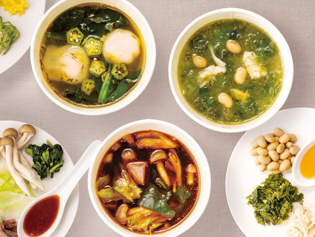 こだわりの素材で丁寧に作られた3つのだしをそれぞれ味わうことや、美容や健康効果の期待ができる具材たっぷりのコンディショニングスープをお楽しみいただけます。