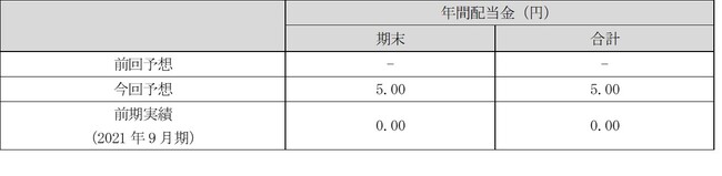 このような状況の中、2022年9月期の配当予想については未定とさせていただいておりましたが、最近の当社業績動向を踏まえ、総還元性向ならびに、株主優待含めた株主総利回りを考慮した結果、1株当たりの年間配当予想を5円に修正(復配)することといたしました。