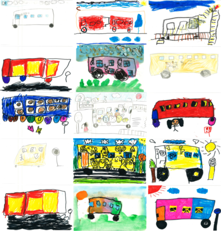そこで、バスのことをもっと知ってもらい、公共交通を支える意識を醸成することを目的に、「バスの日」にちなんで、市内で走行しているバス路線網の歴史の紹介や塗り絵体験などを実施します。その第一弾として、9月9日から市内104人の園児が描いたバスの絵を、町田市立中央図書館で展示します。