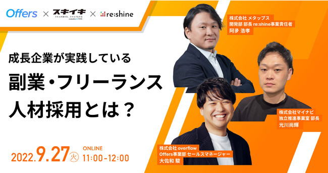 DX支援事業を手掛ける株式会社メタップス(渋谷区、代表取締役社長 山崎 祐一郎)は、2022年9月27日(火)11時00分より、株式会社マイナビ(千代田区、代表取締役 社長執行役員 土屋芳明)、株式会社overflow(港区、代表取締役:鈴木 裕斗・田中 慎)と3社共同で「成長企業が実践している副業・フリーランス人材採用」をテーマに無料のオンラインセミナーを開催いたします。