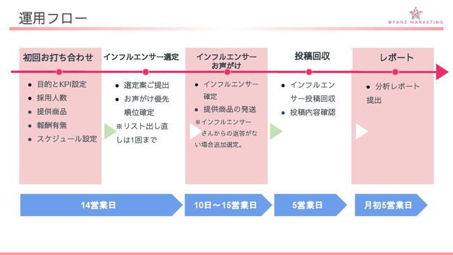初回お打ち合わせ時に企業様の目的・KPIを設定し、インフルエンサーに対する報酬の有無や採用人数・スケジュールなどの設定を行います。その後弊社インフルエンサーコンサルタントによる選定を行い、順次お声がけや提供商品などの発送、投稿を進めて参ります。