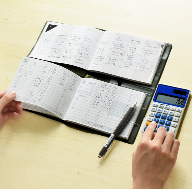 月間カレンダーと家計簿部分を切り分け、手帳カバー内に月間カレンダー手帳と家計簿帳がセットされています。これにより月の予定と支出記録・管理をページ間の移動なく同時に確認する事が可能です。