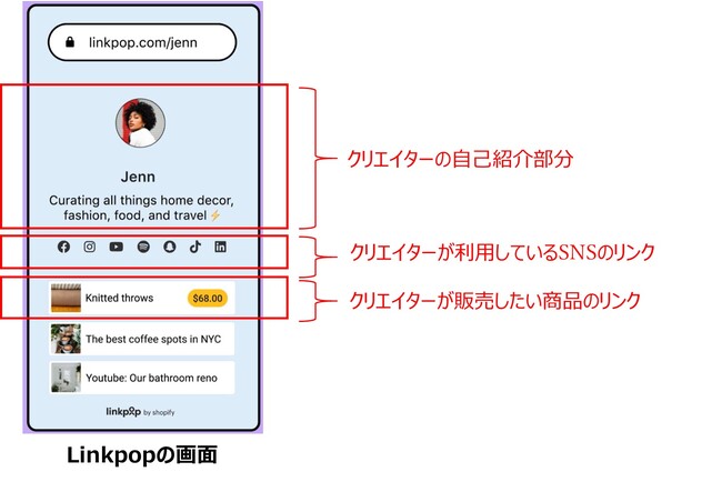 またLinkpopというリンクインバイオツールのサービスも提供しています。Linkpopは、ブランドやクリエイターが持つ様々なソーシャルメディアのプロフィールやその他の関連リンクを、1つのリンクにまとめることができるツールです。このツールにより、クリエイターはバイオリンクを完全なショッパブル(購入可能)体験にすることができます。クリエイターや個人は、自分の作品や活動を紹介しつつ、同じページで自分の作成した商品の販売が可能になります。Shopifyの高速で安全なチェックアウトを搭載しているので、Linkpop は、バイオリンクからチェックアウトの段階まで、お客様を速やかに誘導することができます。Linkpopは、複数のSNSを駆使して活動することが多いクリエイターが、SNSから簡単に商品を販売できるようにサポートする機能です。