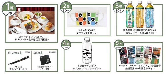 JR東京駅の株式会社JR東日本クロスステーションが運営する施設、店舗、自販機、コインロッカーにて、Suica等交通系電子マネーでのお買い物で、1,000円を一口として抽選会に参加できます。鉄道開業150年グッズや食事券など、合計3,000名に景品が当たります。