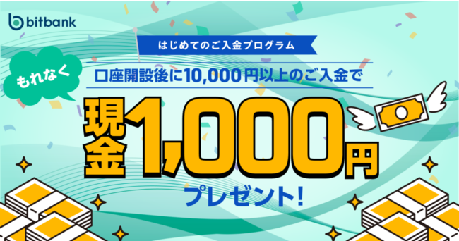 ビットバンク株式会社(本社:東京都品川区、代表取締役社長:廣末紀之、以下「ビットバンク」)では、新たに暗号資産取引をはじめる方々への応援の気持ちを込めて、ビットバンク口座へはじめて10,000円以上ご入金された方を対象に、もれなく現金1,000円がもらえる「はじめてのご入金プログラム」を開始しました。
