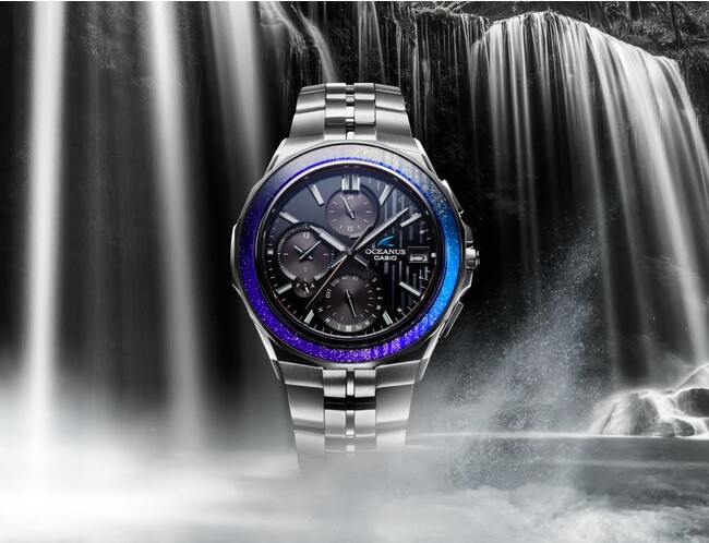 カシオ計算機は、「Elegance, Technology」をコンセプトとした“OCEANUS(オシアナス)”より、薄型の美しいフォルムを追求した“OCEANUS Manta(オシアナス マンタ)”シリーズの新製品として、日本の伝統工芸である蒔絵(まきえ)※を時計ベゼルに採用し、水しぶきが舞い美しく輝く滝の情景を表現した限定モデル『OCW-S5000MB』を10月14日に発売します。