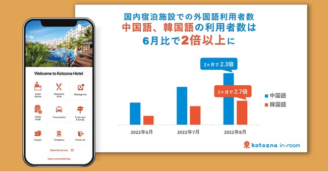 6月の訪日外国人観光客受け入れ再開から2ヶ月、中国語、韓国語の利用者数は2倍以上に。宿泊施設向け多言語コミュニケーションツール「Kotozna In-room」利用データより判明