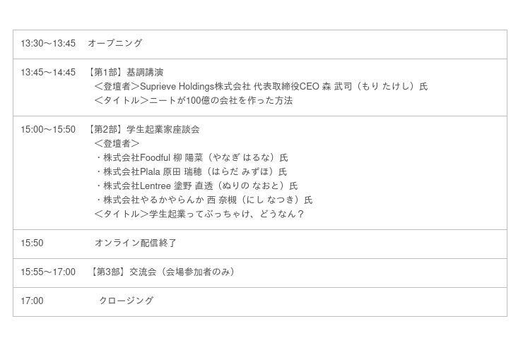 本イベントでは、一旦は夢を諦め会社員になったものの、その後起業して成功した経歴を持つ起業家が、これまでのストーリーを語る基調講演や、学生起業家4名による普段聴くことができない本音トークを座談会形式で実施します。また、リアルなコミュニティの場の提供に加えて、「LINEオープンチャット」を開設し、見る・聴くだけではない全員参加型のコミュニティの場作りをめざします。