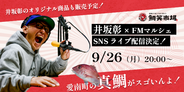 9月26日(月)、よる8時から「井坂彰のGreat Noisy Club!」 放送終わりの井坂彰と松山大学の「愛南マダイ応援隊」がFMマルシェで販売中の鯛笑市場シリーズを紹介します。