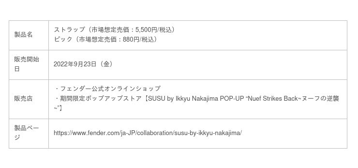 フェンダーミュージック株式会社(所在地:東京都渋谷区、代表取締役社長アジアパシフィック統括 エドワード・コール)は、tricotやジェニーハイのヴォーカリスト&ギタリストとして活躍する中嶋イッキュウのソロプロジェクト“SUSU by Ikkyu Nakajima(スース バイ イッキュウ ナカジマ)”とコラボレーションし、“SUSU”の世界観を詰め込んだギターストラップとピックを9月23日(金)より数用限定でフェンダー公式オンラインショップにて販売することを発表しました。 また、9月23日(金)~25日(日)に期間限定で開催されるポップアップストア【SUSU by Ikkyu Nakajima POP-UP “Nuef Strikes Back~ヌー フの逆襲~”】(場所:Harajuku SPACE BANKSIA)でもお買い求めいただけます。