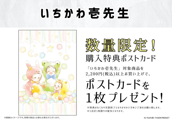 「いちかわ壱先生」対象商品を2,200円(税込)以上お買い上げで、ポストカードを1枚プレゼントしています。数量限定のため、なくなり次第終了です。ご購入はお早めに!