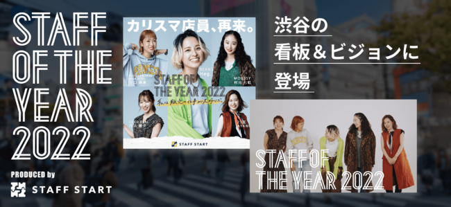 スタッフDXのアプリケーションサービス「STAFF START(スタッフスタート)」を運営する株式会社バニッシュ・スタンダード(本社:東京都渋谷区、代表取締役:小野里 寧晃)が開催した、8万人の店舗スタッフから日本一を決める『STAFF OF THE YEAR 2022』。同コンテストで選ばれた上位5名のカリスマ店員“STAFF OF THE YEAR”が、渋谷の街頭看板(掲載期間:9/16Fri.~9/29Thu. ※予定)、渋谷の大型ビジョン(放映期間:9/19Mon.~9/25Sun.)に登場します。