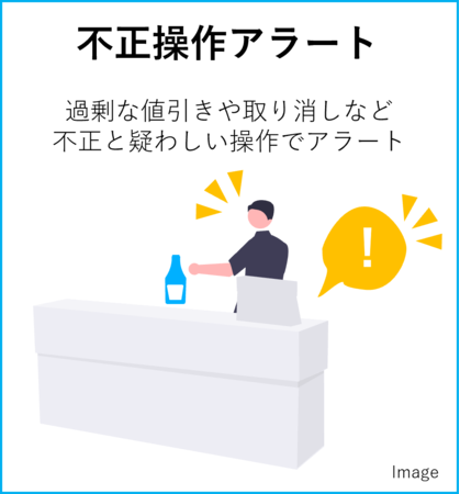 ・概要:故意の過剰な値引きや、取消、訂正、クーポンの打ち直しなど、売上げ操作のような不正と疑われる行為を検知し、警告を行う仕組み