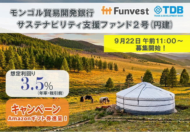 「未来をわかちあう投資」を提供する「Funvest(ファンベスト)」(以下、Funvest)は、「モンゴル貿易開発銀行 サスティナビリティ支援ファンド2号(円建)」(以下、本ファンド)の募集を9/22より開始しますので、お知らせいたします。