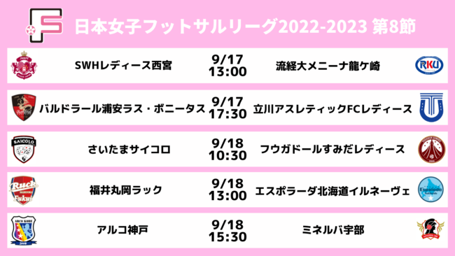9月17日(土)から9月19日(月・祝)の3日間、西宮市立中央体育館/グリーンアリーナ神戸にて日本女子フットサルリーグ2022-2023 第8節・第9節を開催します。今シーズンもSPOTV NOW(登録・視聴無料)にて全試合をライブ配信いたしますので、ぜひご視聴ください!