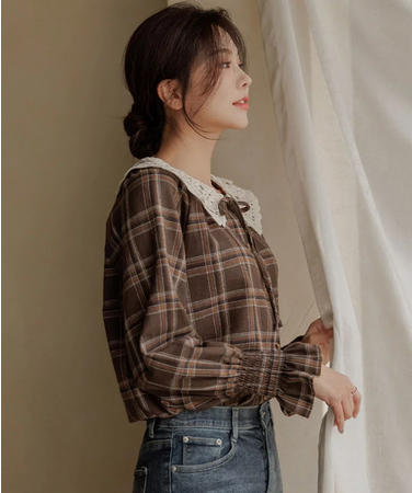 秋冬ファッションにぴったりなチェック柄が目を引くクラシカルなブラウス。レースカラーとギャザードされた袖フリルがガーリーさをプラス。