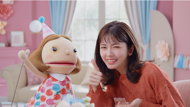 小芝さんとキャンちゃんは仲良しの友達!2人でホームパーティーを楽しんでいます。「シルキースフレアイズ(マットタイプ)」の新色 M05マホガニーモカ をはじめて使う小芝さん。“透けマットデビュー”を記念して、バースデーソングのメロディにのせて、キャンちゃんがオリジナルソングを歌いながらお祝いしています。