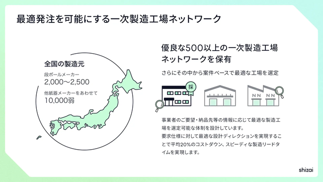 shizaiはEC・D2C事業者のパッケージ制作やコスト削減を推進するオリジナルパッケージ作成プラットフォームです。全国で500以上の一次製造工場ネットワークを保有しており、事業者のご要望・納品先等の情報に応じて最適な製造元を選定可能な体制を設計しています。仕様に応じて最適なサプライヤーを選定し、中間業者を除くことで平均20%のコストダウン、自動見積システムの稼働によるスピーディな製造リードタイムを実現します。