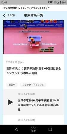 【サービス】 過去の世界卓球の試合から厳選された名シーンを「選手名」からだけではなく、「背面打ち」や「横入れ」のような「技」、さらには「サービスエース」「ロビング」などの「プレーシーン」からも検索できる、これまでになかった画期的なサービスです。