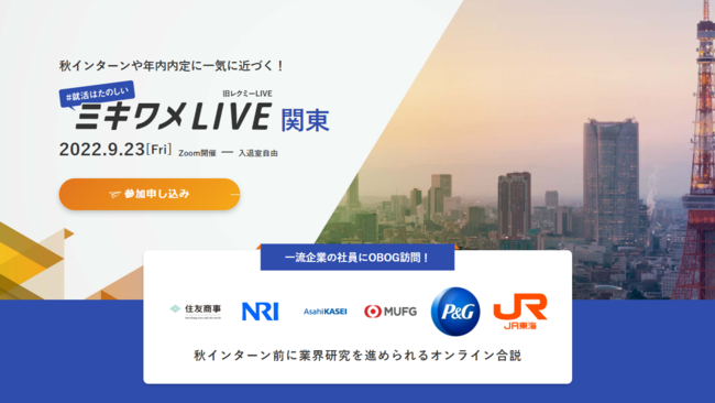 【9月23日(金)、24日(土)開催】商社/コンサル/メーカー/メガバンク/インフラ等、一日で人事に一気にOBOG訪問!就活サービス「ミキワメ」がミキワメLIVE 関東/関西を開催