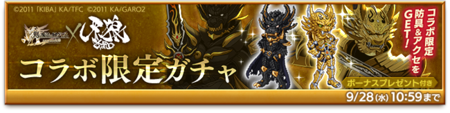 限定コラボ防具&アクセ「黄金騎士」/「暗黒騎士」シリーズが手に入る「コラボ限定 牙狼ガチャ」/「コラボ限定 呀ガチャ」を販売中です。