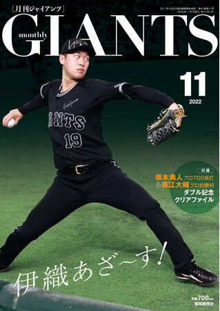 「スポーツ報知」を発行する報知新聞社(代表取締役社長・依田裕彦)は、読売巨人軍監修のファンマガジン「月刊ジャイアンツ」2022年11月号を9月24日から順次、全国の書店、オンライン書店などで発売します。A4版88ページオールカラー、坂本勇人キャプテン通算700長打と直江大輔投手プロ初勝利のダブル記念クリアファイルが付録で、税込み定価700円です。書店での取り寄せ可能。お近くのYC(読売新聞販売店)でも注文を承ります。読売巨人軍公式通販サイト「ジャイアンツオンラインストア」、ECサイト「ショップ報知」でも購入できます。