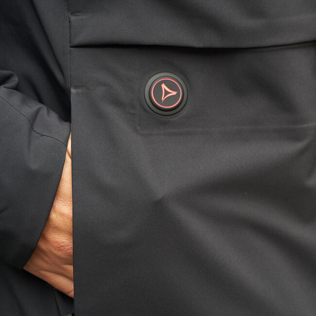 オーストリア アルペン ナショナルチームも採用しているショッフェル社のスキーウェアのテクノロジーを基に、寒冷地での着用を考慮して開発した独自のヒーティングシステム。モバイルバッテリーを電源とし、後部腰位置と左右ポケットのハンドウォーマー部分に設置された特殊なメンブレンが発熱することで衣服内を温めます。