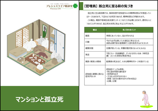 そこで、大和ライフネクストが運営する高齢者向けワンストップ紹介サービス「プレシャスライフ相談室」は、マンション管理の現場で働く当社従業員に向けた「孤立死対応マニュアル マンション管理会社版」を作成。管理会社の立場から「孤立死」を早期に発見するためのポイントや、実際に「孤立死」が起こってしまった際の具体的な対応方法、また「孤立死」を未然に防ぐために日頃の管理業務内でできることをまとめました。